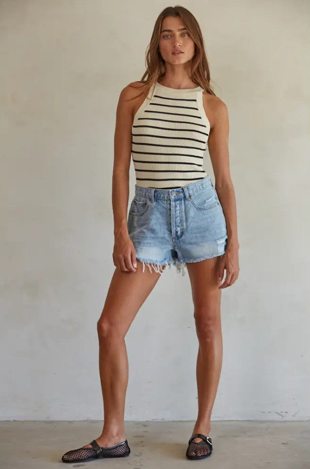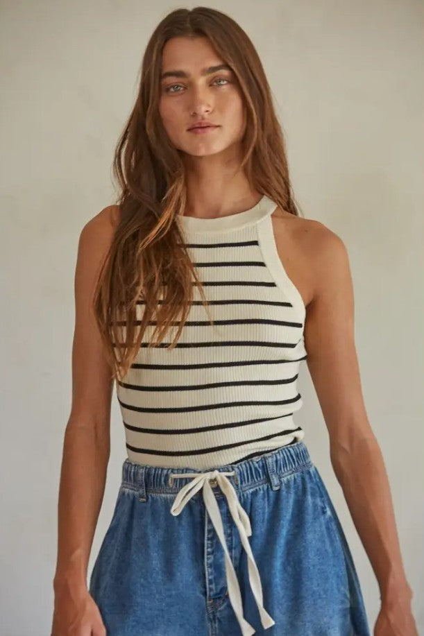 Add a touch of texture to your wardrobe with our Ribbed Striped Knit Tank Top. Made from a soft viscose-polyester blend, this sleeveless sweater-style top features a classic round neck and a flattering, body-hugging fit. The ribbed knit and subtle stripes offer a chic, elevated look—perfect for layering or wearing on its own.